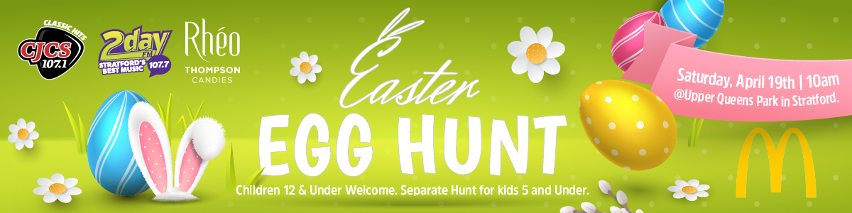 The Easter Bunny is making a stop in Stratford. Kids, grab a basket and head to Upper Queens Park on Saturday, April 19th for the Juice FM/2day FM/Rhéo Thompson Candies Easter Egg Hunt.
