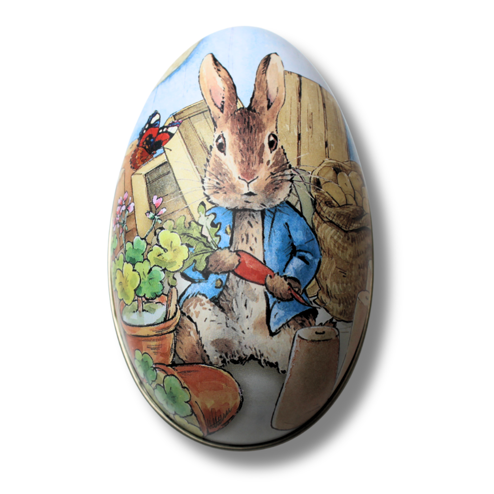 The beloved children's book character, Peter Rabbit, on a keepsake egg tin, filled with our milk chocolate. A stunning Easter gift for all ages.