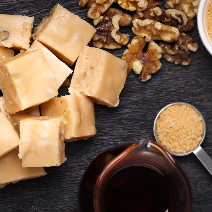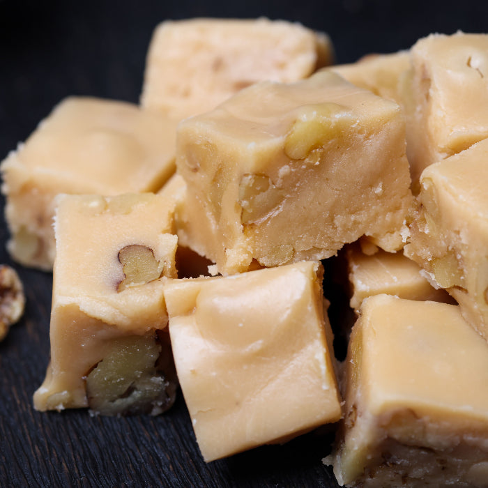 Our melt in your mouth creamy maple nut fudge is made with walnut pieces and local maple syrup.