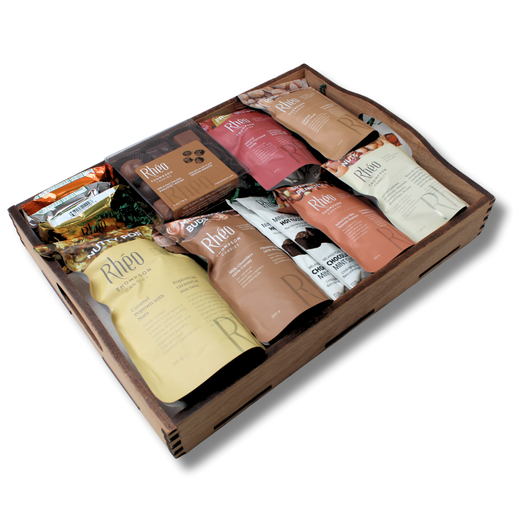 The Canadiana Christmas Tray is a tasty collection of treats all beautifully presented on a Canadian-themed wooden tray. Perfect for corporate gifts or family events! Choose from 6 tray designs featuring Canadian wildlife and symbols, and we will fill it to the brim with Canadian-made candy.