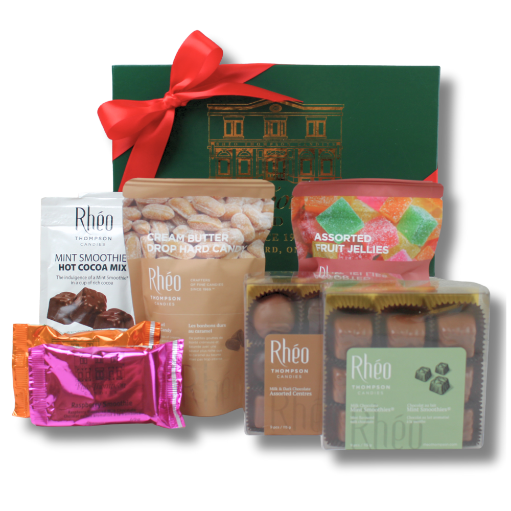 This collection of our popular confections is the perfect assembly of your favourite tasty treats! Share with the office, bring it to the party, or thank the perfect host with this ultimate gift pack! Our collection comes handsomely assembled inside the classic green and gold Rhéo Thompson box and finished with a satin ribbon.