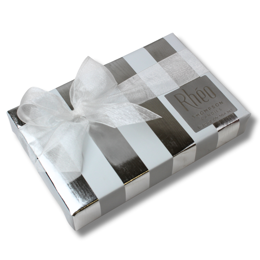 The Silver Bow Box is an elegant christmas gift! Choose from either our iconic milk chocolate Mint Smoothies® or Assorted Chocolates (includes a selection of cream centres, caramels, and nuts enrobed in milk and dark chocolate) and we will wrap it up and finish it with a handcrafted bow!