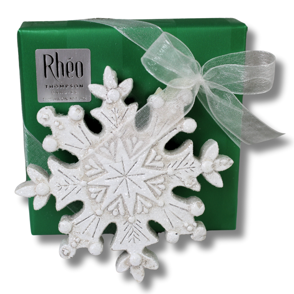 The Sparkling Snowflake Box is a beautiful way to send season's greetings. Choose your chocolates - Milk Chocolate Mint Smoothies or Assorted Chocolates (includes a selection of cream centres, caramels, smoothies, and nuts enrobed in milk and dark chocolate) and we'll finish this stunning gift with a green paper and stunning snowflake ornament.\n\nComplete your gift with a custom card by leaving us your message in the Notes section of the checkout page. We’ll ensure a hand-written gift card goes with your thoughtful gift.