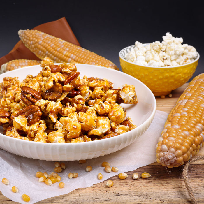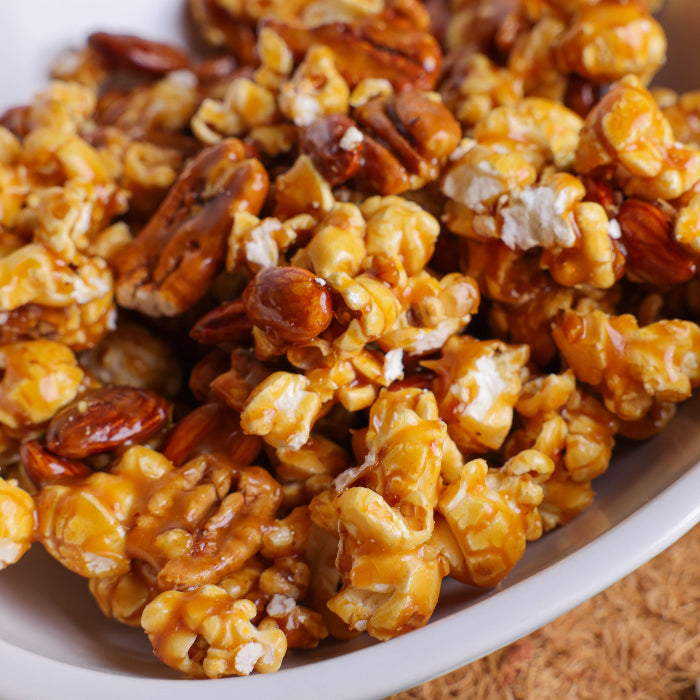 The best thing about peanut brittle is the brittle – that buttery sweet candy coating that is practically wasted on peanuts. Plus, eating whole mouthfuls of brittle can be a bit overwhelming. This is why we take this savoury brittle-coating and drizzle it over kettle popcorn, almonds, and mammoth pecans, allowing everyone to enjoy that buttery sweet goodness in a salty snack that puts regular, mass-produced caramel popcorn to shame.