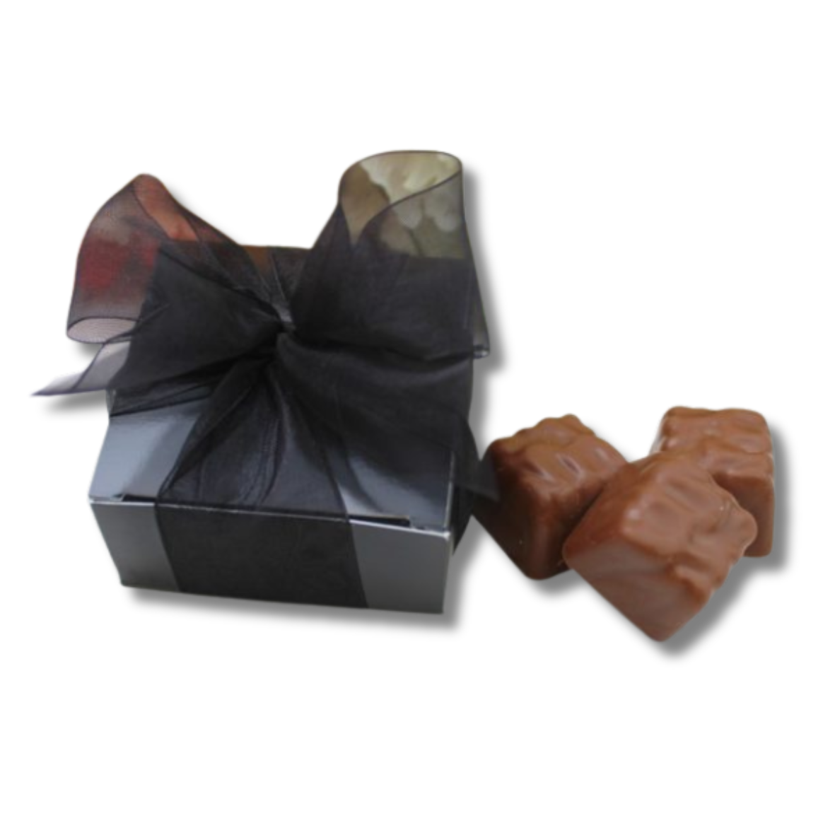 A box of four chocolates of your choice, accented with a ribbon. The perfect wedding favour, shower takeaway or dinner party place setting.
