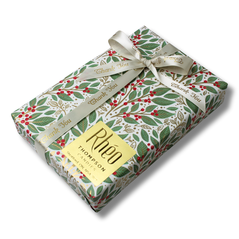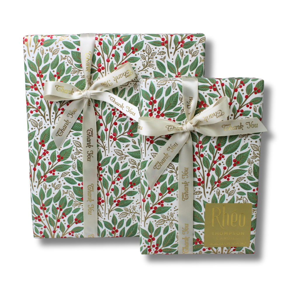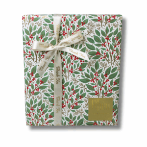 Done up in a beautiful holly berry wrapping paper and tied with ‘Thank You’ satin script ribbon.