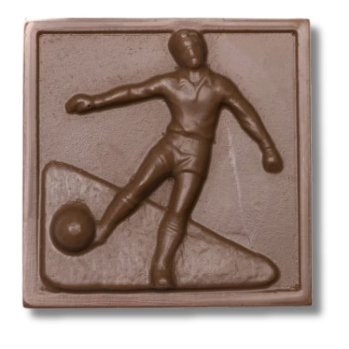This solid milk chocolate Soccer Player scene is approximately 4.25″ in width and height. It comes packaged in a clear cello box.